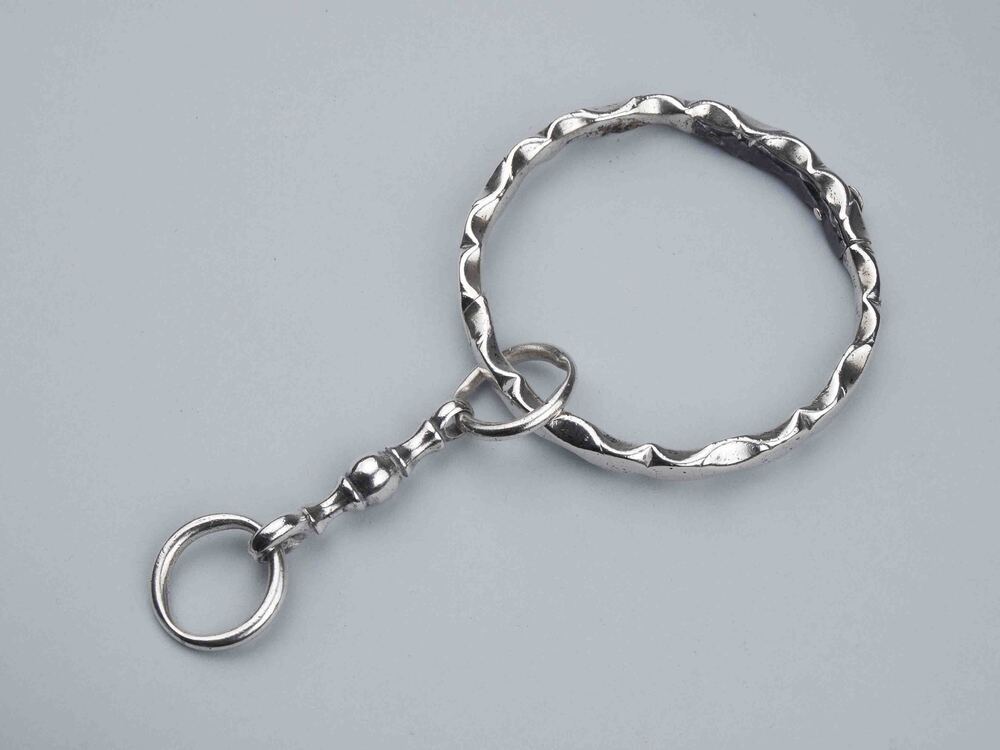 Grote sleutelring, bestaand uit twee scharnierende helften, die door een drukknop geopend worden