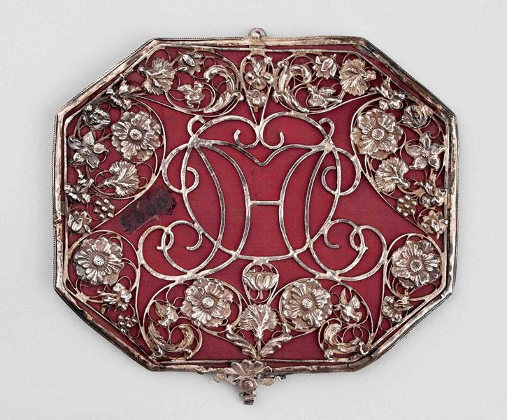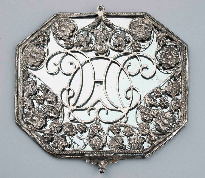 Achthoekig spiegeltje, gevat in een zilveren ajour montuur