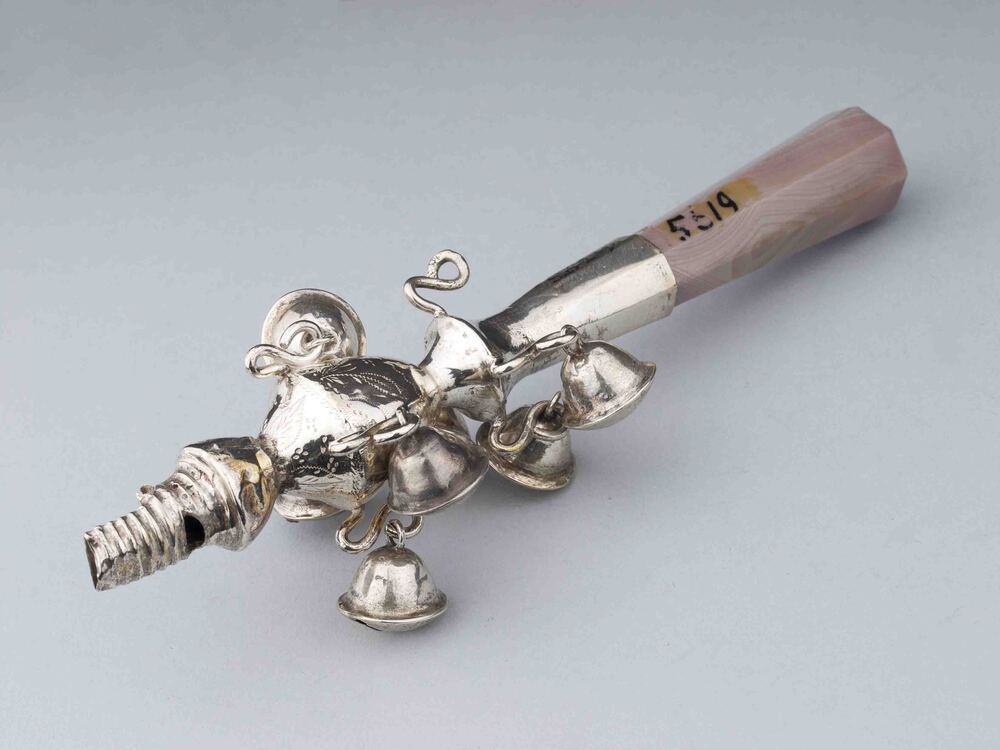 Rinkelbel met onyx handvat, zilveren vaas met fluitje en met zeven bellen