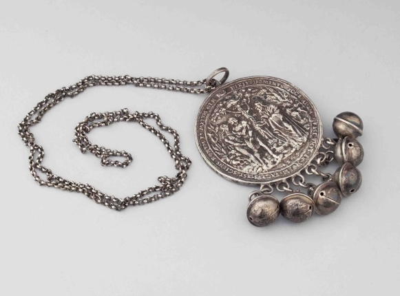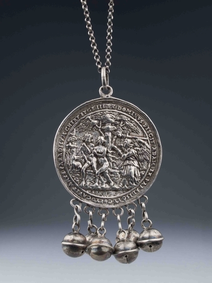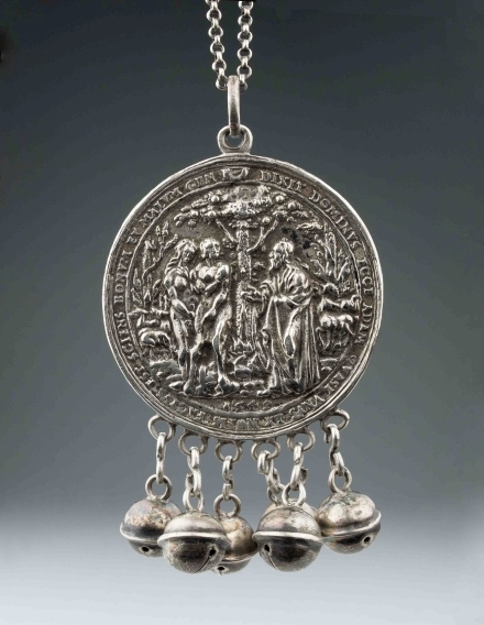 Zilveren penning met Adam en Eva waaraan zes rinkelbellen aan schakelketting