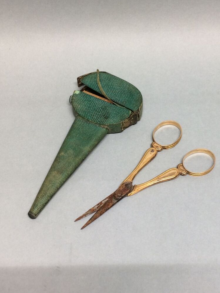 Ceremoniële schaar, mogelijk verguld en voorzien van religieuze voorstellingen. In vrouwenkloosters gebruikt bij de inkleding om een lok af te knippen, in mannenkloosters bij de kruinschering. (Religieus Erfgoedthesaurus) https://data.cultureelerfgoed.nl/term/id/cht/6d0a91a3-b717-4040-b93e-0a908f9d3c7b