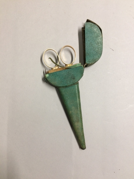 Gouden schaartje in groen slangenleren étui