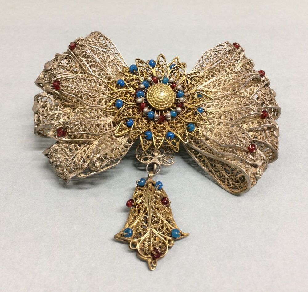 Hanger van zilverfiligrain in de vorm van een strik waarin rode kralen, in het midden een verguld zilveren ster met versiering van blauwe en rode steentjes en pareltjes, met verguld zilveren filigrain aanhangsel