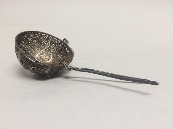 Theezeefje waarvan het filigrainwerk de halve bol in zes parten verdeelt