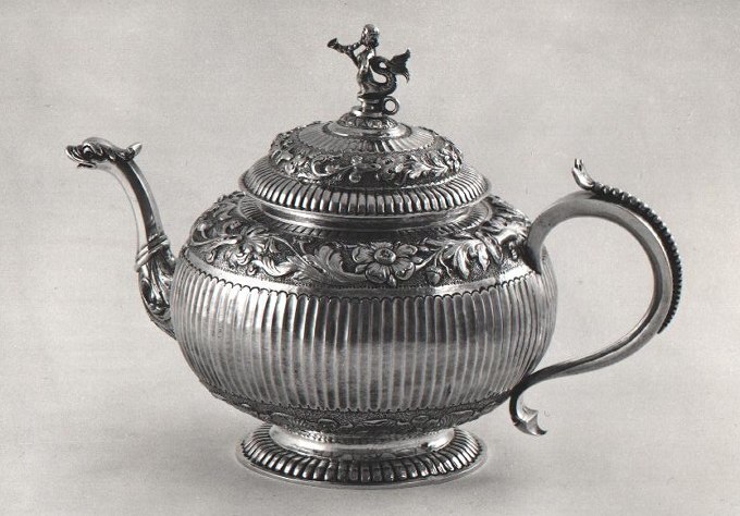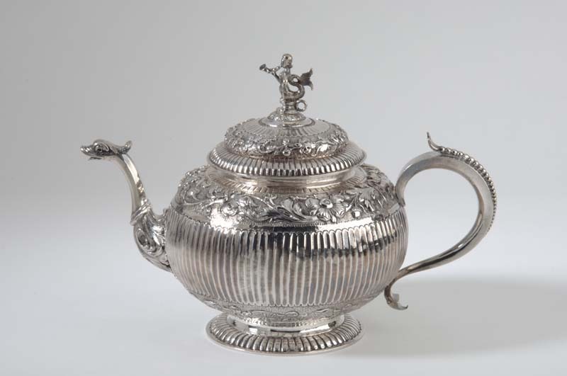 Theepot met op buikwand, rond voet, rand van acanthuspalmetten op gegranuleerde grond, daarboven brede band van cannelures