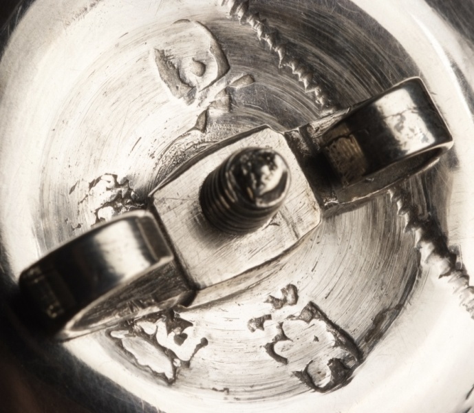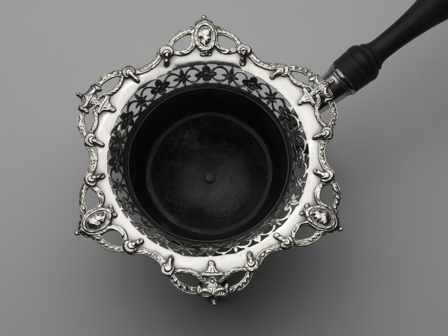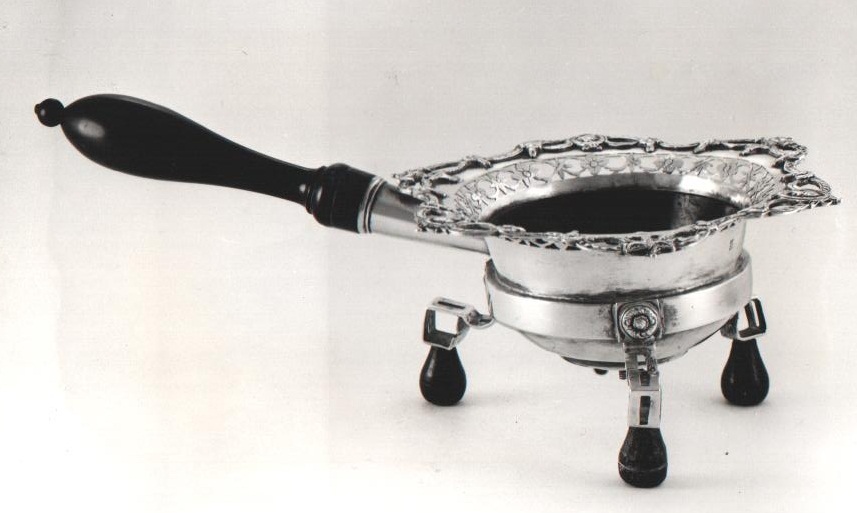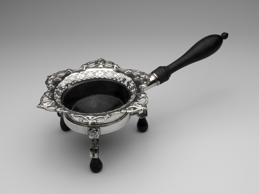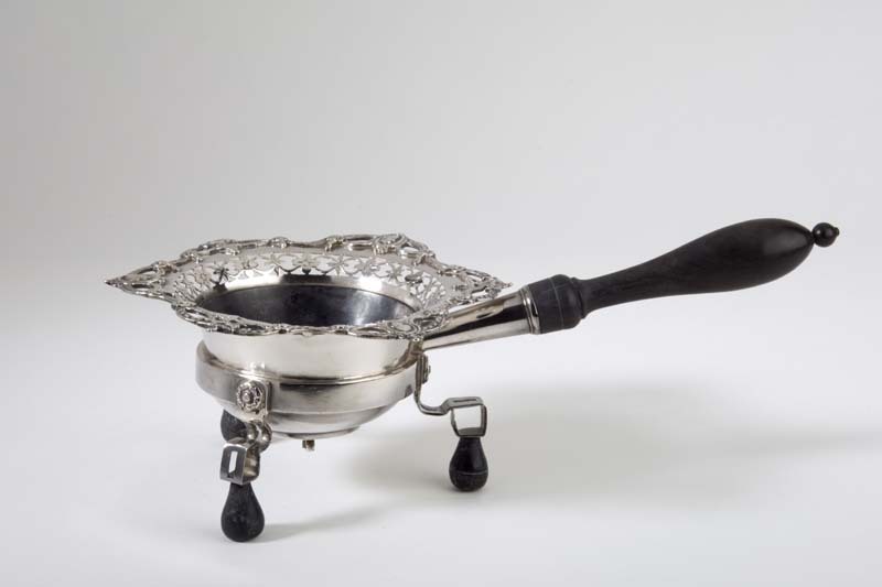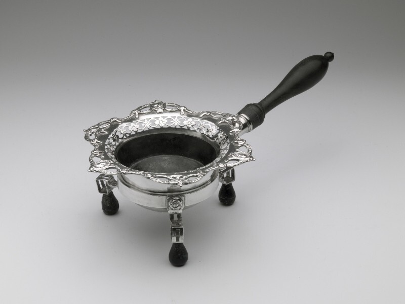 Komfoor met bovenaan zilveren pootjes, op het brede profiel, een bloem