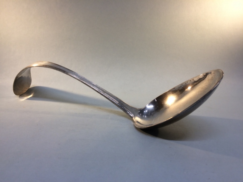Soeplepel waarvan de bovenhelft van de steel breder uitloopt en sterk naar achter omgebogen is