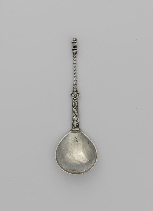 Lepel met als bekroning rechtopzittende leeuw oningevuld schild vasthoudend
