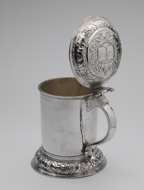 Flapkan met tussen scharnier en deksel rechtopstaand mascaron met adelaar met uitgespreide vleugels erachter