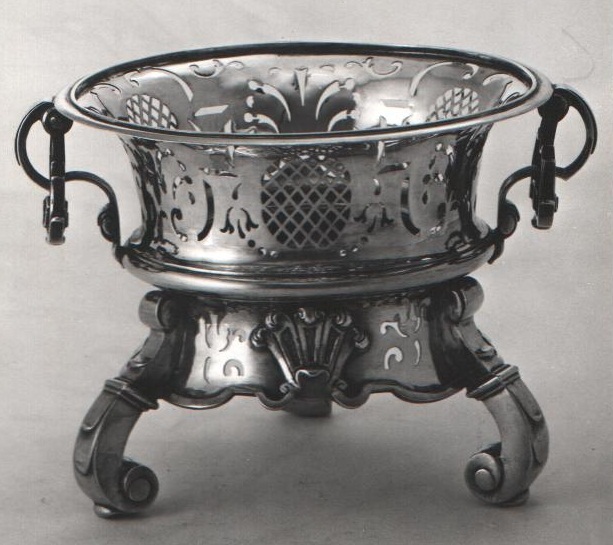 Komfoor met scharnierend handvat, bestaande uit twee antithesische C-vormen met bladmotief ertussen