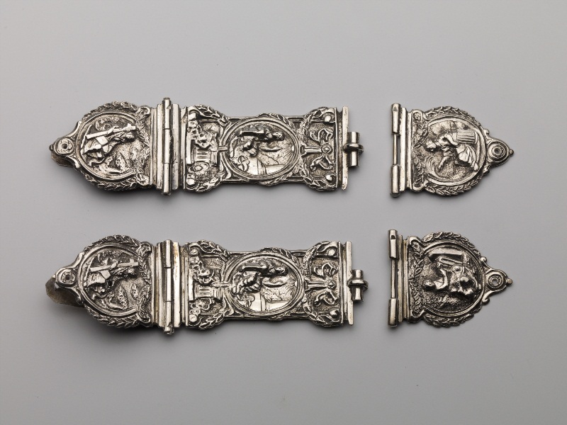 Het geheel van (edel)metalen, geornamenteerde bescherm- en/of versierstukken op kostbare boeken. De delen (kunnen) zijn: de hoeken, een centraal middendeel, klamphouders en klampen en een houder met ring middenboven voor een draag- of vergrendelingsketting.