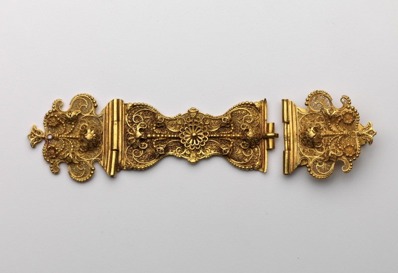 Het geheel van (edel)metalen, geornamenteerde bescherm- en/of versierstukken op kostbare boeken. De delen (kunnen) zijn: de hoeken, een centraal middendeel, klamphouders en klampen en een houder met ring middenboven voor een draag- of vergrendelingsketting.
