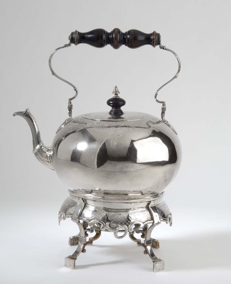 Waterketel met bladguirlande gegraveerd en hieronder rocailles, bloemen en vogeltjes