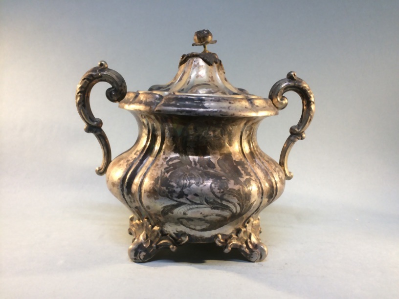 Suikerpot waarvan d knop bestaat uit een roos en een knop aan een gebogen, bladerde steel