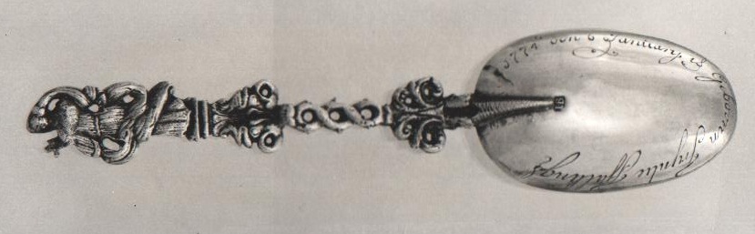 Geboortelepel met als bekroning gevleugeld puttokopje met knop op het hoofd