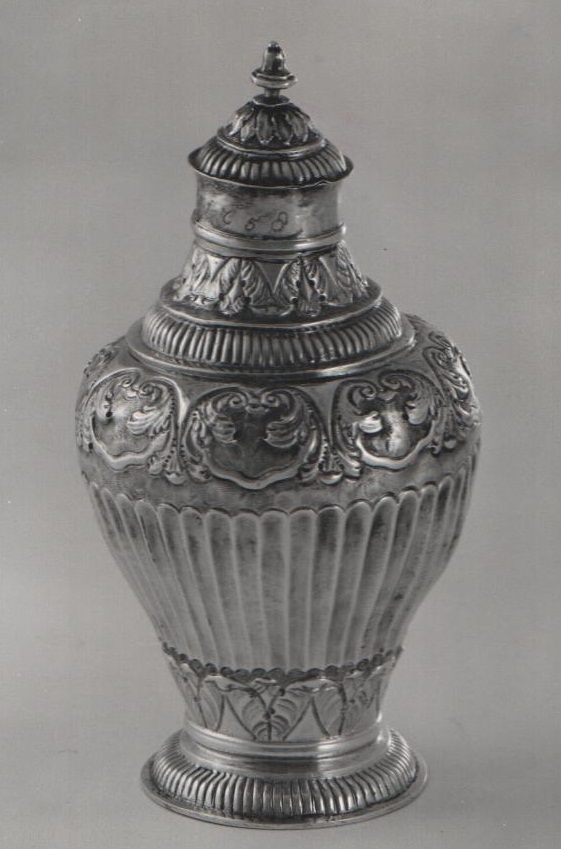 Theebus met op de schouder een band van hangende acanthus-palmetten op gegranuleerde grond