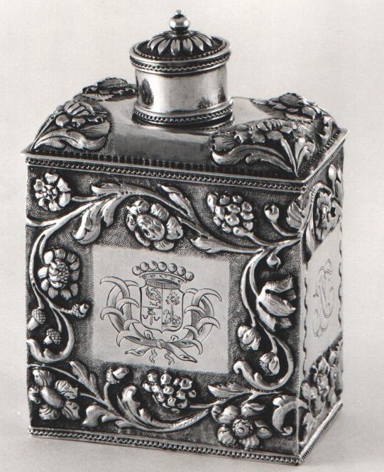 Theebus met midden op de voor- en achterzijde een glad, rechthoekig vak, omgeven door golvende bladerranken met bloemen en vruchtentrossen op gegranuleerde grond
