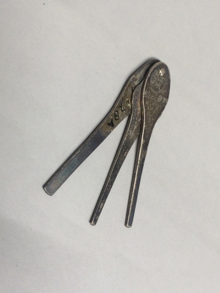 Drie toetsnaalden, drie aan elkaar gekonken, scharnierende staafjes, bovenaan breder uitlopend