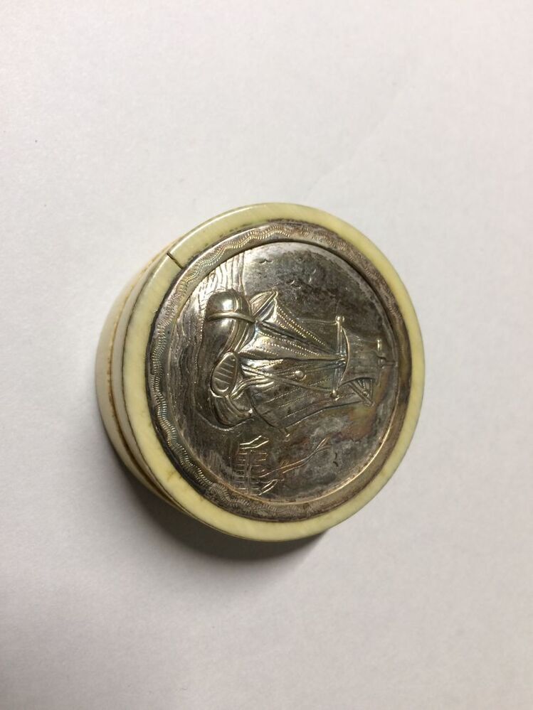 Laag doosje van ivoor met op deksel zilveren plaat met voorstelling van een schip