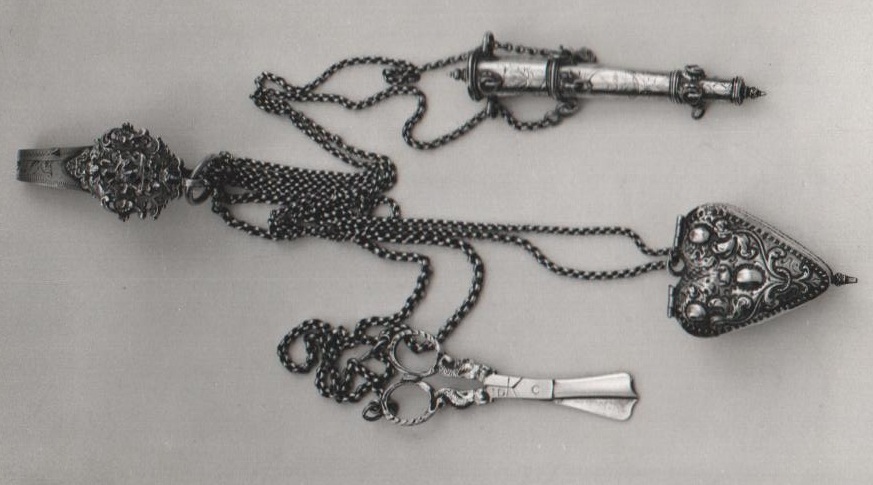 Zilveren prak met drie dubbele kettingen waaraan schaar, naaldenkoker en loddereindoosje