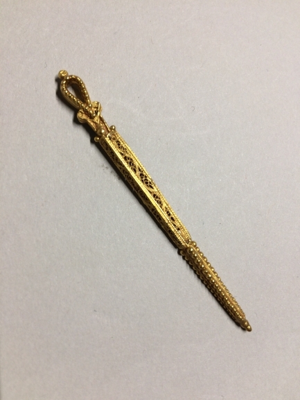 Rijgpen van goud, met oog van filigraanwerk, met parelrand versiering