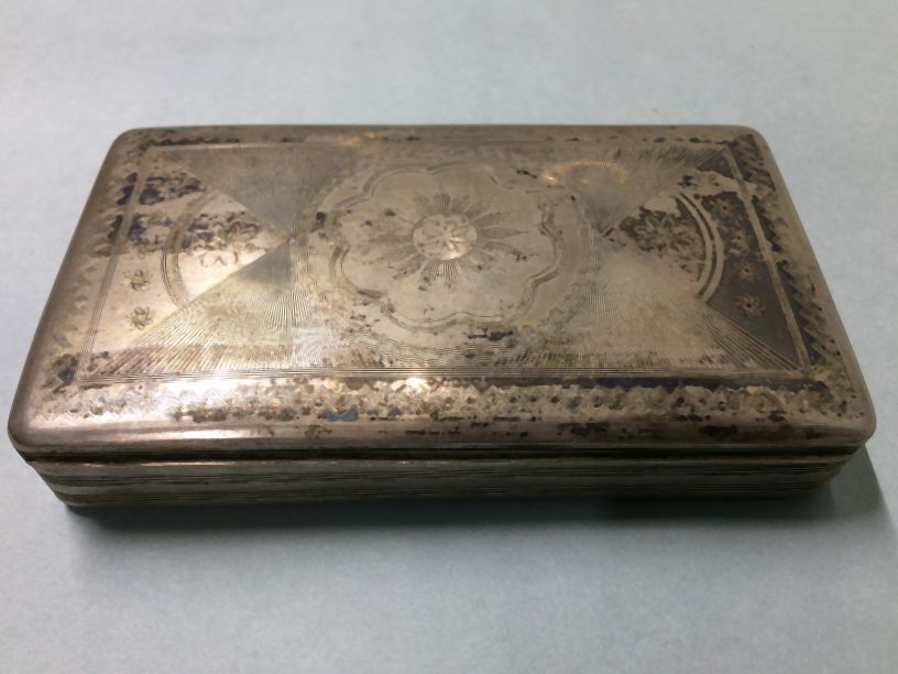 Tabaksdoos met in midden bloem met stralenkrans er omheen