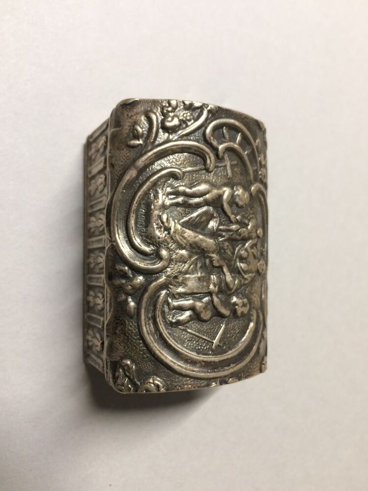 Loddereindoosje met op deksel zittende vrouw, leunend met de linkerarm op een korte zuil, in de rechterhand een palmtak, voorstellend de Vrede