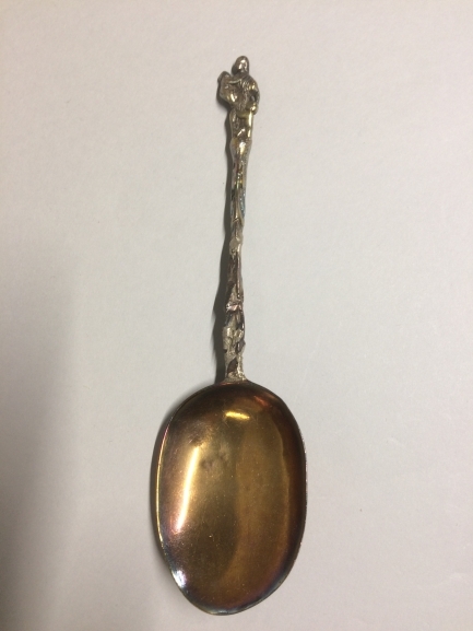 Lepel met als bekroning staande vrouw een kind dragend en één aan de hand