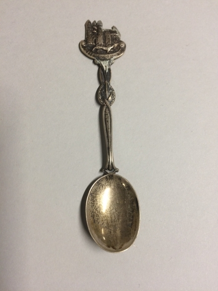 Theelepeltje met een afbeelding van een kerk in Romaanse stijl, waarvoor een hond