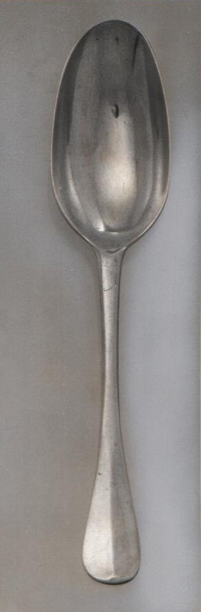 Lepel met gerekt eivormig blad, dubbel lof met de gegoten steel verbonden