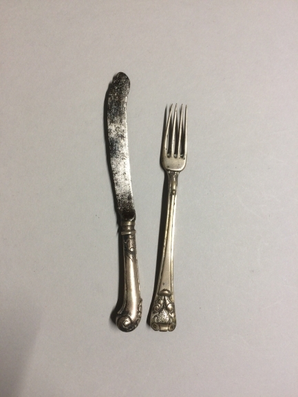 Miniatuur mes en vork waarvan het mes een pistoolheft heeft