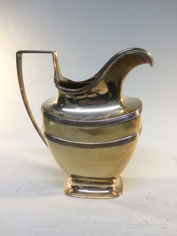 Melkkan met bovenlangs de voet, onder en bovenlangs het bolverjongende gedeelte van het vat en op het oor een filet