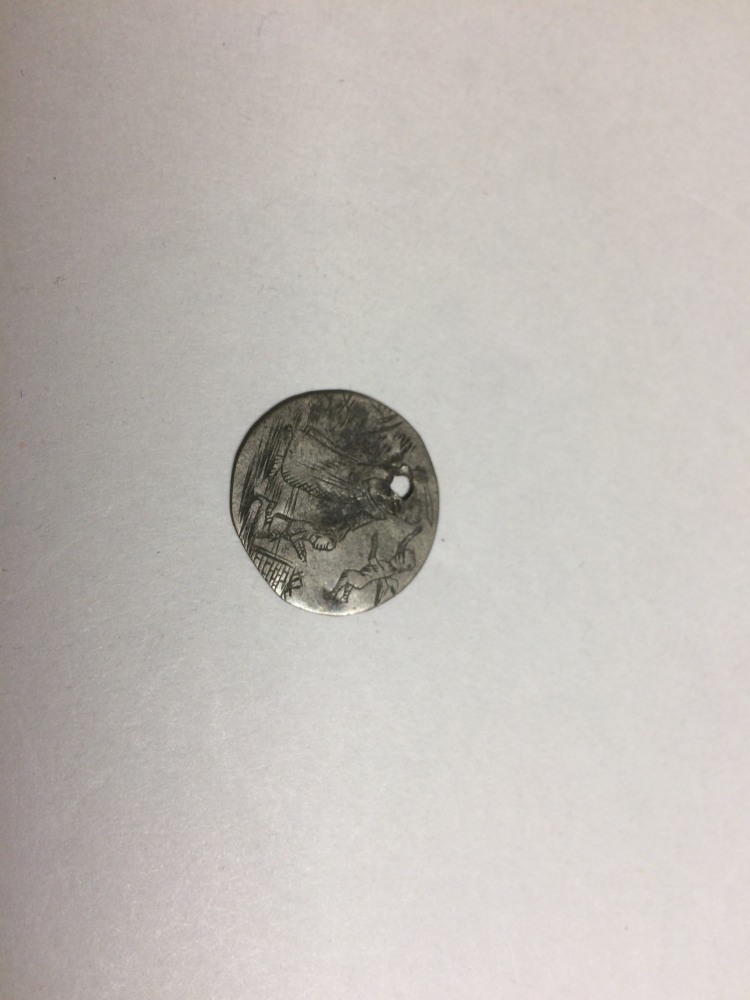 Plat, bijna rond plaatje, met bovenin een gaatje, op ene kant gegraveerd: Abraham en Isaac met takken op de schouder op weg naar de offerplaats