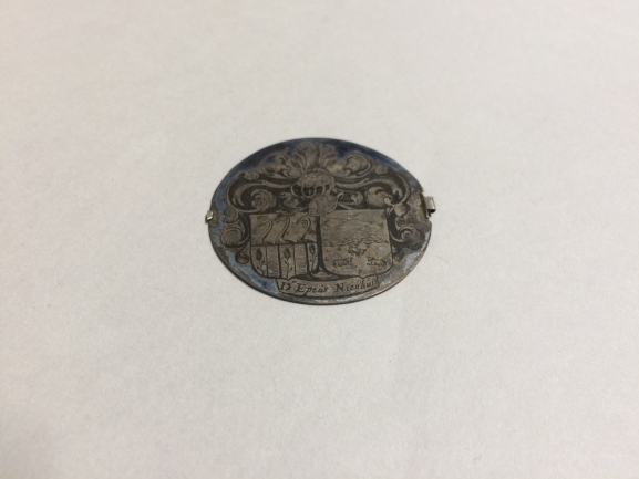 Wapenplaatje met twee wapens gedekt door een helm met wrong