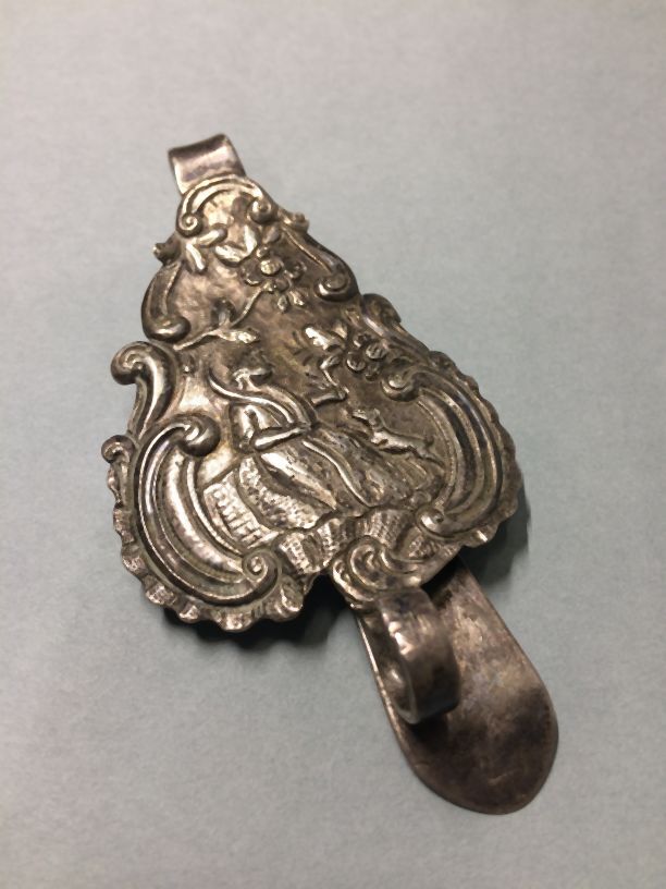 Haak van een beugeltas met voorstelling van zittende vrouw met boog en hond (Diana)