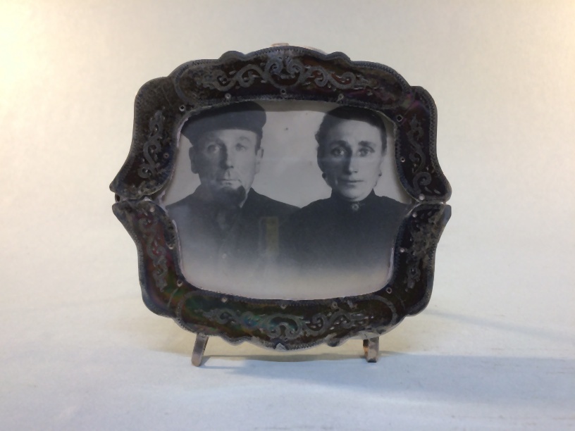 Zilveren fotolijstje met foto van echtpaar, met pootje