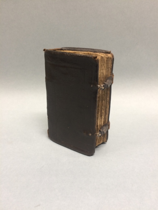 Psalmboek met twee leren klampjes waarop zilveren schelpje met oog