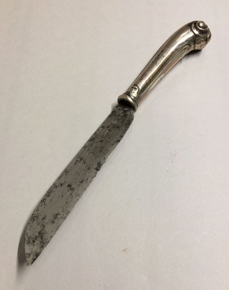 Zilveren mes met pistoolheft met inscriptie T.U.