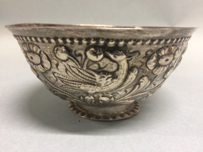 Roomkom met op de wand van het vat tweemaal twee symmetrische bladertakken met bloemen, waartussen een vogel, die in vruchten pikt