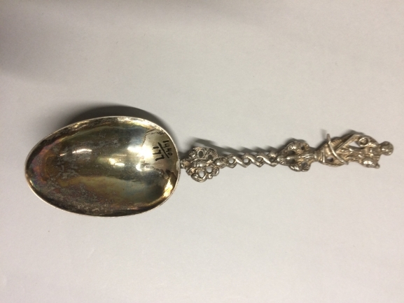 Lepel met bekroning van vrouw met anker en vogel