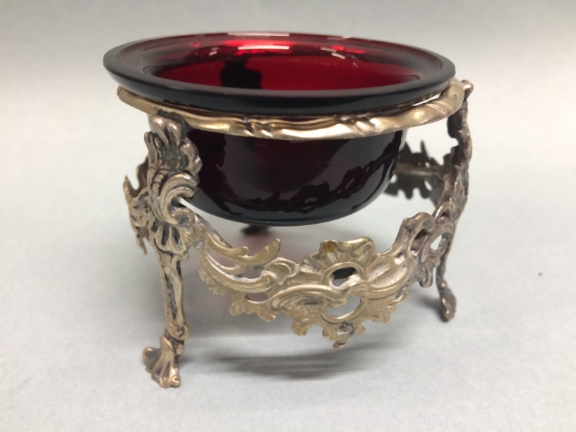 Zoutvaatje op drie pootjes verbonden door rococo krulwerk