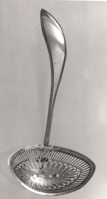 Suikerstrooier van zilver met gebogen, platte steel