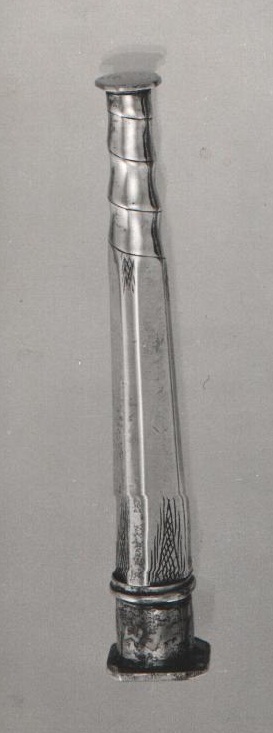 Naaldenkoker met bovenaan de koker, onder de schroefdraad, een driehoekige palmet van ruitpatroon