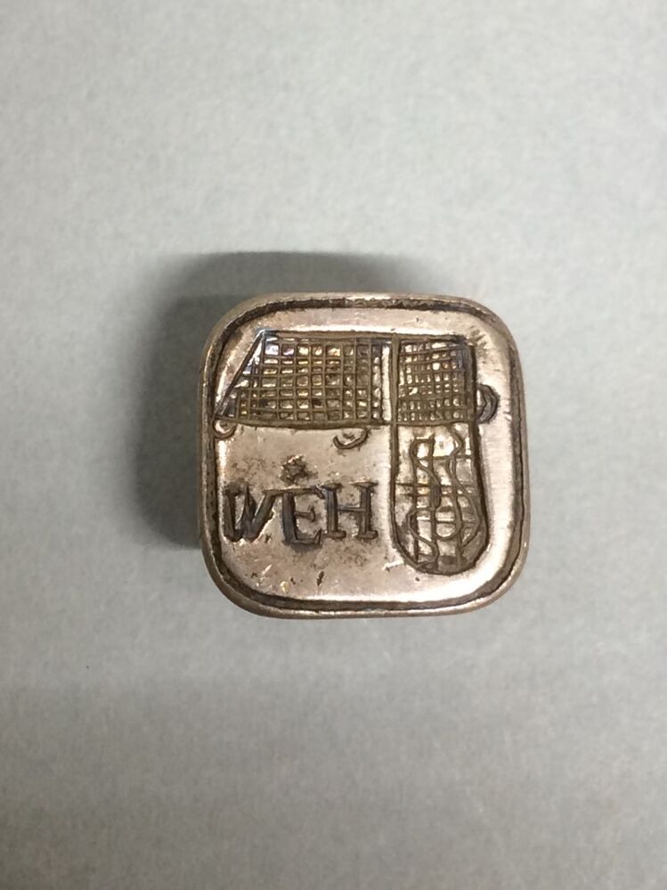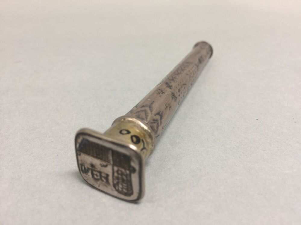 Achtkantig naaldenkokertje waarvan de bovenkant van dop als cachet dient