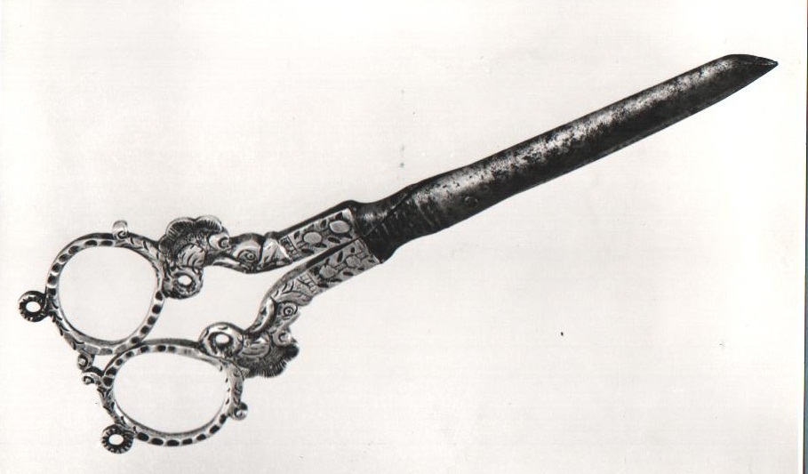 Ceremoniële schaar, mogelijk verguld en voorzien van religieuze voorstellingen. In vrouwenkloosters gebruikt bij de inkleding om een lok af te knippen, in mannenkloosters bij de kruinschering. (Religieus Erfgoedthesaurus) https://data.cultureelerfgoed.nl/term/id/cht/6d0a91a3-b717-4040-b93e-0a908f9d3c7b