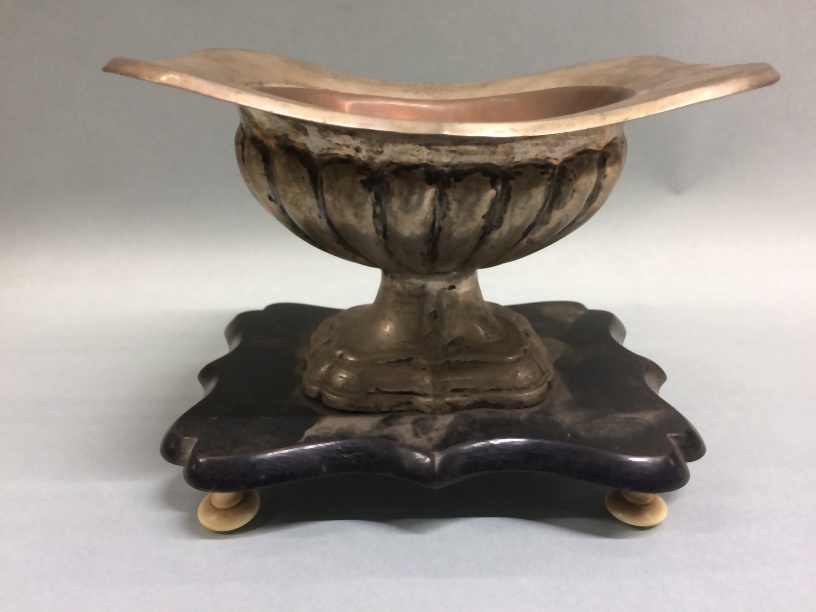 Aansteekkomfoor met op de voet op de hoeken een blad gegraveerd, in het midden van de zijden een palmet