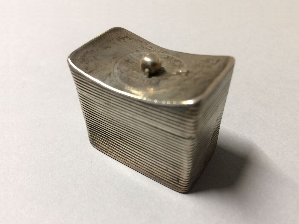 Loddereindoosje met holle deksel waarop knopje waarom heen bloemblaadjes