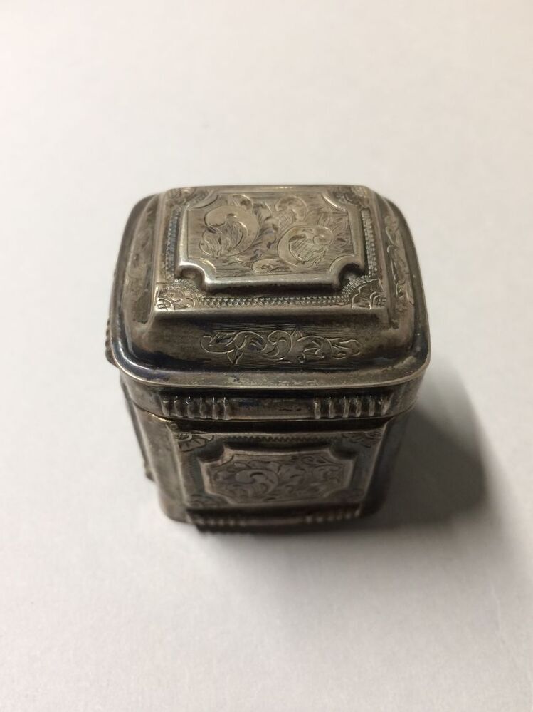 Vierkant lodderijndoosje, op de bodem is ingepunt A.A.Z. 1858