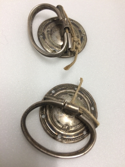 Twee leibandringen, ronde, iets bolle plaat, waarin langs de rand zes plaatjes zitten