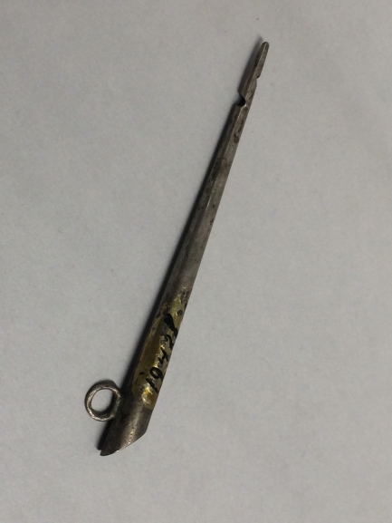 Smal, spits toelopend melkbuisje, schuin afgesneden. Bij punt twee gaatjes. Bovenaan opzij een oogje
